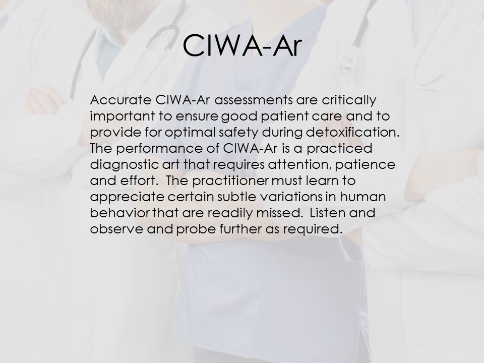 Ciwa Ar Form - This clinical tool assesses 10 common withdrawal signs. (24 hour clock, blood pressure:. A score of 15 + points means the patient may be at increased risk of alcohol withdrawal.