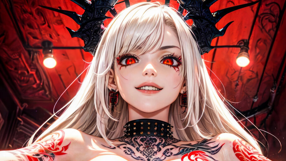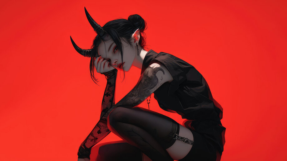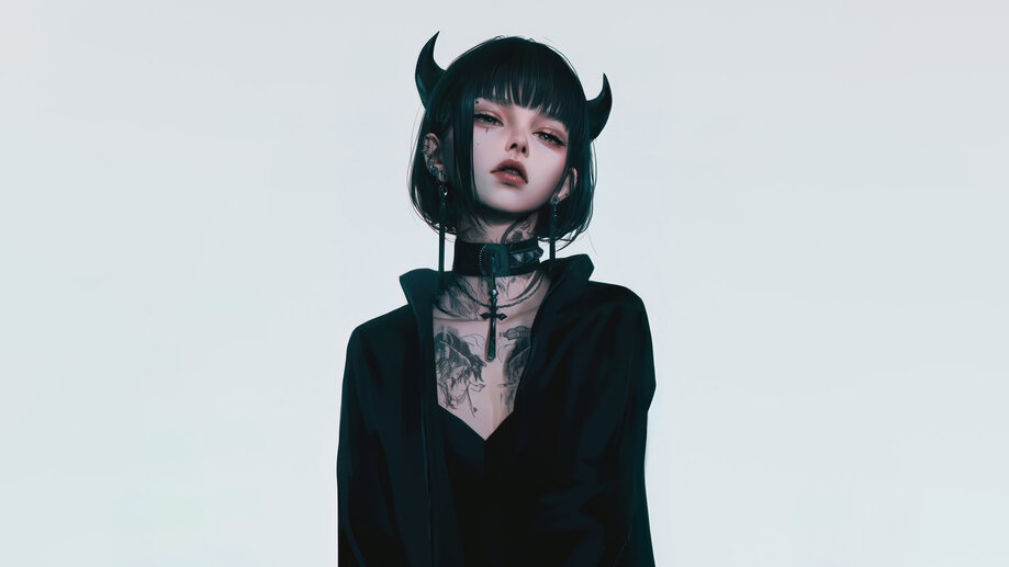 6832b Anime, Girl, Demon, Horn, with, Tattoo, 8K Wallpaper PC Desktop